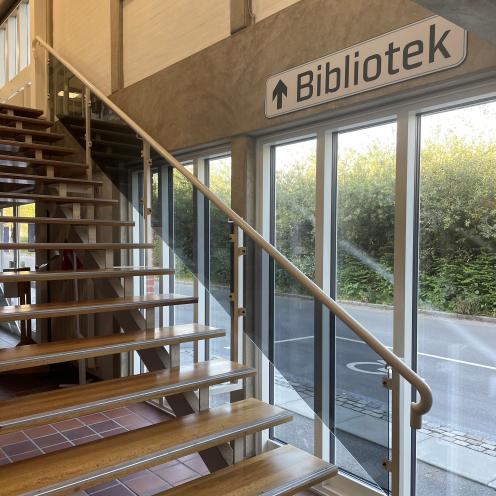 Du kan tage elevatoren op til biblioteket (den er til højre efter hovedindgangen) eller trappen (den er til venstre efter hovedindgangen).